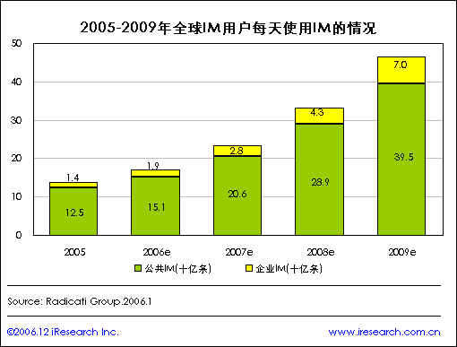 iResearch艾瑞市場(chǎng)咨詢根據(jù)Radicati Group統(tǒng)計(jì)顯示,到2005年底,全球總共有超過(guò)8.67億人在使用即時(shí)短信息軟件,到2009年,這個(gè)數(shù)字會(huì)增至12億。而整個(gè)IM市場(chǎng)(包括公眾IM和企業(yè)所用的EIM以及IM管理軟件)到2005年底將達(dá)到1.42億美元,到2009年更會(huì)增長(zhǎng)到3.65億美元。據(jù)Radicati統(tǒng)計(jì),目前每天網(wǎng)絡(luò)上發(fā)送的IM信息達(dá)139億條,其中125億條在公眾網(wǎng)絡(luò)上發(fā)送,14億條在企業(yè)內(nèi)部通過(guò)EIM發(fā)送。從IM軟件用戶的增長(zhǎng)趨勢(shì)可以預(yù)測(cè)出,到2009年,網(wǎng)絡(luò)上每天發(fā)出的IM信息數(shù)量將達(dá)到465億條,其中395億條在公眾網(wǎng)絡(luò)上傳輸,其余70億條在企業(yè)內(nèi)部傳輸。