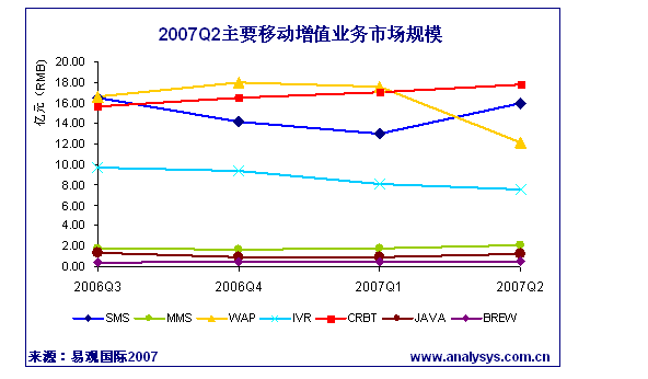 易觀國際研究表明,2007年第2季度移動增值服務(wù)整體市場規(guī)模為57.42億元,同比下降2.33%。其中彩鈴業(yè)務(wù)收入居首位達17.75億元。