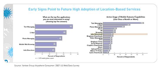 當(dāng)美國(guó)聯(lián)邦通信委員會(huì)(FCC)在2001年強(qiáng)制要求實(shí)施911增強(qiáng)功能時(shí),移動(dòng)行業(yè)就開始通過(guò)將導(dǎo)航服務(wù)引入大眾市場(chǎng)來(lái)獲利。7年后,絕大多數(shù)手機(jī)都集成了GPS功能,幾大主要的移動(dòng)運(yùn)營(yíng)商也都計(jì)劃在年內(nèi)推出至少一項(xiàng)基于GPS 的導(dǎo)航應(yīng)用。揚(yáng)基集團(tuán)認(rèn)為,2008年正在成為美位置服務(wù)的轉(zhuǎn)折點(diǎn)。