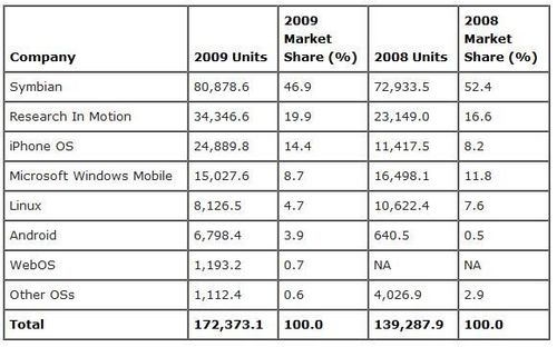 根據(jù)Gartner的數(shù)據(jù)顯示,去年共銷售出的智能手機(jī)達(dá)1.72億部,比前年上漲了24%,然而全世界手機(jī)的銷售總量卻并無起色(2008年為12.2億部,而2009年為12.1億部。在去年銷售的所有手機(jī)中,智能手機(jī)占14%,較2008(11%)年有所提升。iPhone盡管去年漲勢(shì)迅猛,只占去年各種手機(jī)銷售總量的2%。