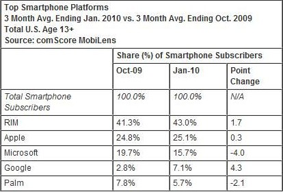 智能手機市場調查數(shù)據(jù)稱,在2009年11月至2010年1月間,4270萬美國人擁有智能手機,比第三季度上漲了18%。RIM公司以43%市場占有率的絕對優(yōu)勢占據(jù)著美國智能手機市場的頭把交椅,同比公司第三季度數(shù)據(jù)上漲了1.7%。蘋果則以25.1%的市場份額位列第二。微軟(15.7%),谷歌(7.1%),以及Palm(5.7%)占據(jù)了市場前五名的位置。值得一提的是,谷歌Android手機的市場銷售額表現(xiàn)出了持續(xù)性的增長。