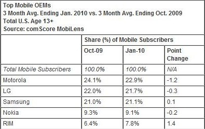 報告數(shù)據(jù)表明,截止至1月份,在2.34億的美國手機用戶中,摩托羅拉以22.9%的市場份額占據(jù)著領先位置,而LG則以21.7%的數(shù)據(jù)排名第二。緊隨其后的分別是三星公司(21.1%),諾基亞(9.1%)以及RIM(7.8%)。