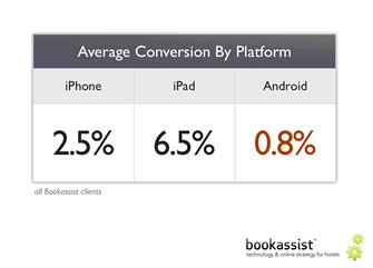 當(dāng)你看到以下數(shù)據(jù)時(shí),會(huì)覺(jué)得很有趣,Android用戶帶來(lái)的轉(zhuǎn)化率遠(yuǎn)低于平均水平,僅為0.8%;iPhone用戶帶來(lái)的轉(zhuǎn)化率是Android的3倍,為2.5%;而iPad用戶帶來(lái)的轉(zhuǎn)化率是Android的8倍,為6.5%。iPad帶來(lái)的轉(zhuǎn)化率出奇的高,體現(xiàn)了消費(fèi)者使用iPad的熱情。所以酒店經(jīng)營(yíng)者應(yīng)該優(yōu)先考慮此平臺(tái),確保他們的網(wǎng)站都針對(duì)iPad進(jìn)行了優(yōu)化。