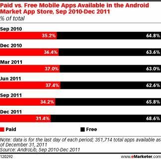 通過(guò)對(duì)2010年9月至2011年12月Android Market應(yīng)用商店的分析,進(jìn)一步表明了對(duì)免費(fèi)應(yīng)用模式的依賴(lài)性。根據(jù)第三方應(yīng)用程序跟蹤服務(wù)AndroLib提供的數(shù)據(jù),2010年9月Android Market應(yīng)用商店下載的大約65%應(yīng)用均為免費(fèi)應(yīng)用;在2011年12月,這一比例已經(jīng)提升至69%。