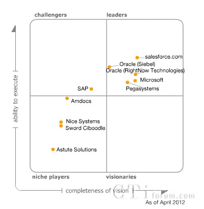 位于魔力象限中領導者(leaders)象限的廠商有salesforce.com公司、Oracle (RightNow Technologies)公司、Oracle (Siebel)公司、Microsoft公司和Pegasystems 公司。位于挑戰(zhàn)者(challengers)象限的廠商是SAP公司。位于觀望著(niche players)象限的廠商是Amdocs公司、Astute Solutions公司、Nice Systems公司和Sword Ciboodle公司。