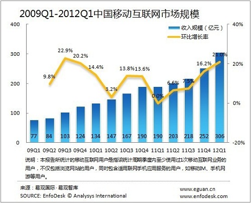易觀:2012Q1中國(guó)移動(dòng)互聯(lián)網(wǎng)市場(chǎng)規(guī)模突破300億