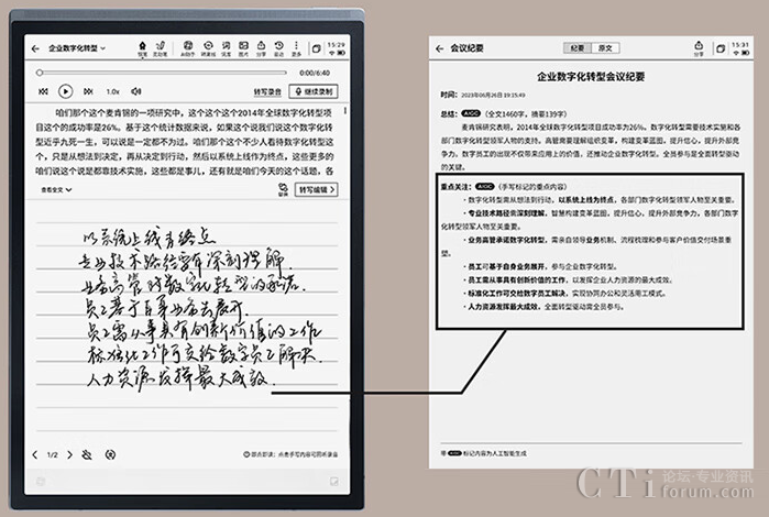其中會(huì)議紀(jì)要功能,可將科大訊飛智能辦公本的語(yǔ)音實(shí)時(shí)轉(zhuǎn)寫(xiě)功能與墨水屏紙感書(shū)寫(xiě)相結(jié)合,并且可以對(duì)會(huì)議記錄內(nèi)容形成一份精簡(jiǎn)的會(huì)議紀(jì)要,有助于快速回溯會(huì)議內(nèi)容。