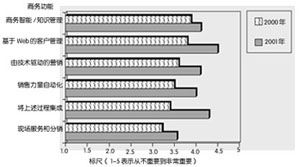 在目前的配置中,呼叫中心是主要的CRM解決方案。如果將2000年底以前的實施算在內(nèi),緊隨其后的是銷售力量的自動化(67%)和電子管理(64%)。多數(shù)被調(diào)查者都配置了現(xiàn)場服務(wù)、分銷(33%)和TEM(30%)方案。但是,在過去的9 個月里,人們比較關(guān)注銷售力量的自動化和基于Web的銷售、營銷等問題。這符合Internet和移動設(shè)備的使用不斷增加的現(xiàn)狀。