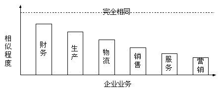 很顯然,企業(yè)間業(yè)務(wù)的相似程度越高,采用商用軟件的有效率越高,企業(yè)在采用商用軟件的時(shí)候軟件的客戶化定制就越少,實(shí)施的成功率越高。財(cái)務(wù)軟件是目前商用軟件通用最有效的企業(yè)管理軟件就是明證。從圖中可以看出前面的幾種業(yè)務(wù),是 傳統(tǒng)ERP軟件支持的功能;而后面的銷售、服務(wù)和市場(chǎng)是目前CRM軟件所要實(shí)現(xiàn)的功能。如果說,企業(yè)采用現(xiàn)有的ERP商品套件來滿足企業(yè)運(yùn)營(yíng)管理的需要還需要30%的客戶化工作,那么如果采用商用的CRM軟件,軟件廠商提供的軟件要應(yīng)用于企業(yè),就需要更多的客戶化工作,這個(gè)比例幾乎接近于企業(yè)自己開發(fā)。