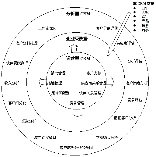 能提供上述問題和其他企業(yè)問題的客戶信息,就能夠?qū)蛻舴⻊?wù)、銷售技巧和隨后的促銷戰(zhàn)略作出關(guān)鍵決策。通過對“運(yùn)營型”CRM數(shù)據(jù)與來自于全公司的信息進(jìn)行集成,公司便能夠開始執(zhí)行分析型CRM;并且執(zhí)行后,可以作出真正的“以客戶為中心”的企業(yè)決策。