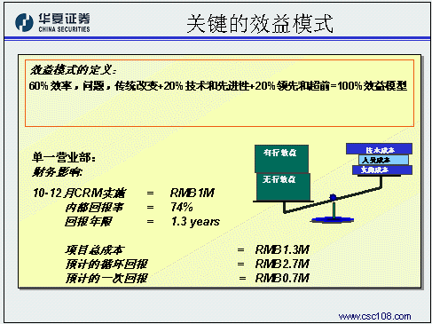 華夏證券經(jīng)紀(jì)業(yè)務(wù)總部的姚磊作為唯一的成功應(yīng)用案例代表,主要是和與會(huì)的金融機(jī)構(gòu)分享在客戶關(guān)系管理規(guī)劃方面的一些成功經(jīng)驗(yàn)。華夏證券認(rèn)為,對(duì)于證券公司的經(jīng)紀(jì)業(yè)務(wù)來講,客戶關(guān)系管理的主要目標(biāo)應(yīng)該是把客戶關(guān)系管理系統(tǒng)的核心功能融入開戶、交易、服務(wù)、咨詢等四個(gè)與客戶互動(dòng)的過程之中,比如:客戶資料規(guī)戶整合形成統(tǒng)一的客戶號(hào),管理客戶交易偏好和產(chǎn)品偏好上的變化,配合多種渠道建立一對(duì)一銷售流程,客戶終身價(jià)值管理。在風(fēng)險(xiǎn)控制方面,華夏證券同樣貢獻(xiàn)了寶貴的經(jīng)驗(yàn),在這方面他們認(rèn)為最重要的方面是要做好高層領(lǐng)導(dǎo)的灌輸和培訓(xùn)工作,讓企業(yè)的高層領(lǐng)導(dǎo)對(duì)于客戶關(guān)系管理有一個(gè)正確的理解,從而對(duì)于項(xiàng)目的投資有一個(gè)合理的預(yù)期和實(shí)證,通俗一點(diǎn)說,就是首先為整個(gè)項(xiàng)目找一個(gè)合適的發(fā)起人。第二點(diǎn)要注意,要有專業(yè)的項(xiàng)目管理隊(duì)伍,這其實(shí)就是集成商選擇方面的風(fēng)險(xiǎn)。除此之外,還要對(duì)項(xiàng)目要有一個(gè)明確的定義,關(guān)注每一步提交的結(jié)果,在項(xiàng)目過程中就隨時(shí)發(fā)現(xiàn)問題、解決問題。