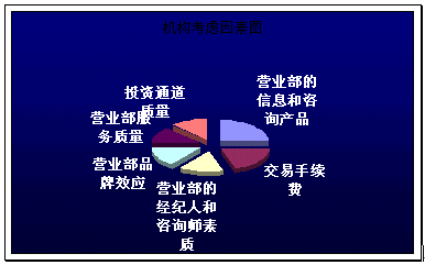 。。具筆者調(diào)查,現(xiàn)在對營業(yè)部盈利最大的是機(jī)構(gòu)客戶或者大額個(gè)人投資者,而隨著股市行情的低彌,他們在選取營業(yè)部的考慮因素主要關(guān)鍵點(diǎn)及其所占比例如下圖: