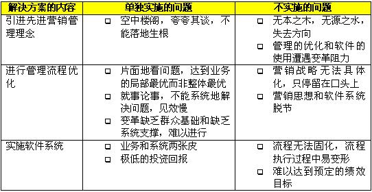 在CRM出現(xiàn)以前,企業(yè)為了解決市場、銷售和服務(wù)方面的問題,更好地吸引、獲得、保留和發(fā)展客戶,采取了各種方式,比如使用一套分銷管理的解決方案,或者請"點(diǎn)子公司"出謀劃策,或者尋求某個(gè)具體業(yè)務(wù)的優(yōu)化。以上這些做法往往只能完成局部的改進(jìn),或取得短期的效果,無法形成長期和整體的競爭優(yōu)勢。原因就在于這些解決方案都只提供了片面的、局部的解決方案,"頭痛醫(yī)頭,腳痛醫(yī)腳"不能綜合管理理念、業(yè)務(wù)流程和技術(shù)應(yīng)用這三個(gè)方面,系統(tǒng)地分析和解決問題。下表中分析了這些解決方案單獨(dú)實(shí)施或者不實(shí)施會(huì)帶來什么問題。
