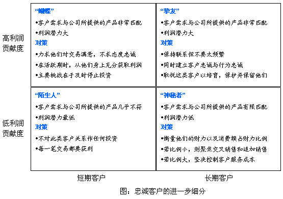 CRM廠商和業(yè)界普遍認(rèn)為:只要贏得了客戶的忠誠,企業(yè)將"財(cái)源滾滾";因此企業(yè)在培養(yǎng)客戶忠誠方面的開支在逐步上升。因?yàn)閺谋砻嫔峡磥,客戶滿意度、客戶忠誠度和客戶保留度越高,客戶利潤貢獻(xiàn)度就大。但事實(shí)并不如他們所愿,《哈佛商業(yè)評論》最新的論文,研究表明:客戶滿意度、客戶忠誠度與客戶利潤貢獻(xiàn)度的關(guān)聯(lián)程度比預(yù)期的要小得多。企業(yè)應(yīng)當(dāng)對忠誠客戶再進(jìn)行細(xì)分,然后在更細(xì)化的客戶基礎(chǔ)上對其進(jìn)行分類管理,并采取相應(yīng)的對策。在論文中,作者根據(jù)利潤貢獻(xiàn)度大小與客戶的短長期兩個(gè)維度,將忠誠客戶進(jìn)行了深層次細(xì)分。主要分成四類:"蝴蝶"、"摯友"、"陌生人"、"神秘者"。企業(yè)應(yīng)該根據(jù)每一類的情況采取相應(yīng)的對策。管理那些能使企業(yè)盈利但不忠誠的客戶--"蝴蝶"--的關(guān)鍵是,在他們購物時(shí)盡可能地從他們身上獲利。對那些既能帶來利潤又忠誠的客戶--"摯友",細(xì)心呵護(hù)他們則更為恰當(dāng)。至于那些忠誠但不能帶來利潤的客戶--"藤壺",你需要做的是確定他們是否有增加消費(fèi)的潛力。最后,對于"陌生人"--那些既不忠誠又沒有利潤可賺的客戶,答案當(dāng)然很簡單:早點(diǎn)認(rèn)出他們,不對他們做任何投資。