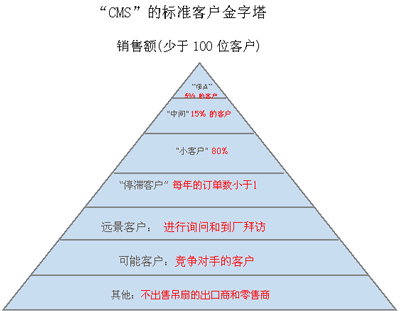 搜集了去年的銷售數(shù)量之后,“CMS”得出了以下的客戶金字塔。由于高端20%的核心客戶占總收入的80%,因此使用以上的方法來(lái)保留他們很重要。除此之外,對(duì)該公司來(lái)說(shuō)通過(guò)獲取歐洲和南美地區(qū)的新客戶來(lái)增加客戶基數(shù)也是十分必要的。