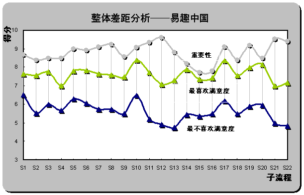 2) 重要流程欠缺最優(yōu)體驗(yàn)。雖然易趣中國被認(rèn)為是最不喜歡的在線銷售網(wǎng)站,但從滿意度評分也同時(shí)可以發(fā)現(xiàn),易趣中國在S1(瀏覽速度),S16(個人定制促銷信息的發(fā)布)和S15(個性化頁面設(shè)置)還是為用戶設(shè)計(jì)了相對較好的體驗(yàn)。但重要性得分排名前三位的子流程中,S12(產(chǎn)品質(zhì)量可靠)、S21(退換貨服務(wù))和S22(客戶投訴和反饋)仍為重要性與滿意度差距最大的三個子流程,易趣中國也未在重要流程上為用戶設(shè)計(jì)優(yōu)越的在線體驗(yàn)。