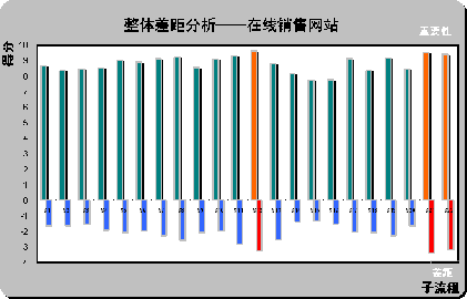 。2)整體差距分析(Gap Analysis)。請見上圖X軸下方所示,計(jì)算所有被調(diào)查對所列在線銷售網(wǎng)站的滿意度平均值(綜合最喜歡在線銷售網(wǎng)站和最不喜歡在線銷售網(wǎng)站的滿意度,計(jì)算被調(diào)查者對22個子流程的滿意度評分)。通過計(jì)算重要性和滿意度的差距,首先,一個有趣的現(xiàn)象,在著色的三個差距最大的子流程剛好也是重要性得分排名前三位的流程S12,