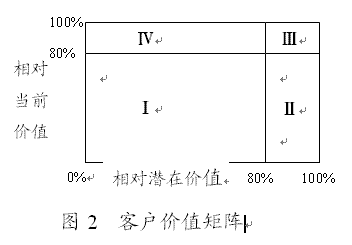(二)確定客戶當前相對價值和客戶相對潛在價值通過預測,識別出了客戶當前價值CCV和增值潛力CPV。但是,這兩個維度指標,均以絕對價值形式出現(xiàn)對客戶進行細分并不理想(張國方,金國棟,2003(3)),在一定程度上會影響到理論應用的方便性(簡便性)。因此,可以采用更加明了和更具有實踐操作性的維度指標——客戶當前相對價值和客戶相對潛在價值。“客戶的相對當前價值”是指某一客戶提供的當前價值與企業(yè)未來可望實現(xiàn)的當前價值總額的比值;而“客戶的相對潛在價值”是某一客戶提供的增值價值與企業(yè)未來可望實現(xiàn)的全部最大增值價值的比值。