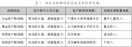 流程由活動、活動的邏輯順序、活動的實現(xiàn)方式、活動的承擔者四個基本要素組成。通過活動的整合來產(chǎn)生“流程多面手”或活動講廢除來減少成本,利用信息技術將“串聯(lián)”活動變成“并聯(lián)”活動來改變活動斬邏輯順序以提高流程效率,或者改變活動承擔者的數(shù)量或素質,這些都將導致流程群資源分配的變動。例如,銀行的業(yè)務流程設置:低價值客戶以電子設備的自助服務為主;中價值客戶以柜面服務為主;高價值客戶以大戶室一對一服務為主;設置專業(yè)化的理財中心,由客戶經(jīng)理全程代為辦理各項業(yè)務,同時由高素質的理財專家根據(jù)客戶的風險收益偏好提供高質量的理財產(chǎn)品等?梢,不同客戶其流程的資源配置差異較大。依據(jù)客戶群——流程矩陣,下表描述了四類流程群所對應的四類客戶群的四種資源配置方式。