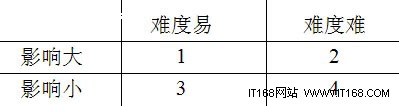 在實(shí)際工作中,筆者一般都會(huì)將用戶的需求進(jìn)行分類。如下圖所示,筆者會(huì)按兩個(gè)角度對(duì)需求進(jìn)行歸類,分別按難度與影響程度進(jìn)行區(qū)分。如根據(jù)難度可以將需求分為容易實(shí)現(xiàn)和實(shí)現(xiàn)起來(lái)比較困難兩個(gè)級(jí)別。而根據(jù)影響程度可以將需求分為影響大和影響小兩類。