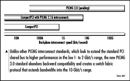 PICMG是CompactPCI的升級(jí)標(biāo)準(zhǔn),但是與CompactPCI有很大的不同,CompactPCI是共享式總線(xiàn)結(jié)構(gòu),而PICMG提供了交換式連接,每個(gè)點(diǎn)到點(diǎn)的連接能達(dá)到10Gbps的帶寬。圖1所示為幾種技術(shù)的互聯(lián)帶寬比較。PICMG標(biāo)準(zhǔn)的提出主要是針對(duì)電信行業(yè)方面的應(yīng)用,因此在供電方面采用了電信界的雙-48V電源標(biāo)準(zhǔn),而非CompactPCI的ATX電源標(biāo)準(zhǔn)。因此,PICMG標(biāo)準(zhǔn)與CompactPCI在很大程度上不兼容。