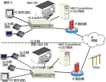 NBX商用話機(jī)是基于 SIP的以太網(wǎng)話機(jī),它內(nèi)含兩個標(biāo)準(zhǔn)以太網(wǎng)接口,可與局域網(wǎng)交換機(jī)直接連接,同時拖帶一臺 PC上網(wǎng)。由于話機(jī)本身就支持