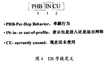 Diff-Serv比Int-Serv 更具可擴(kuò)展性,如圖3所示,它可用于企業(yè)的廣域網(wǎng)中,并在運(yùn)營(yíng)商網(wǎng)絡(luò)中發(fā)揮重要的作用,因?yàn)樗梢愿鶕?jù)應(yīng)用或業(yè)務(wù)類型排出不同的優(yōu)先級(jí)別。業(yè)務(wù)區(qū)分結(jié)構(gòu)使用IPv4報(bào)頭中的業(yè)務(wù)類型(ToS)字段,并將8 位ToS字段重新命名,作為DS字段,其中6位可供目前使用,剩余2位以備將來使用,如圖4所示。通過該字段的標(biāo)記,下行節(jié)點(diǎn)可以獲取足夠的服務(wù)質(zhì)量信息,以對(duì)到達(dá)該端口的數(shù)據(jù)包做出相應(yīng)的“處理”,將它們正確地轉(zhuǎn)發(fā)給下一跳的路由器。這里需要注意, ToS字段和DS字段的定義是不同的。邊緣路由器可以將ToS字段映射到DS字段。