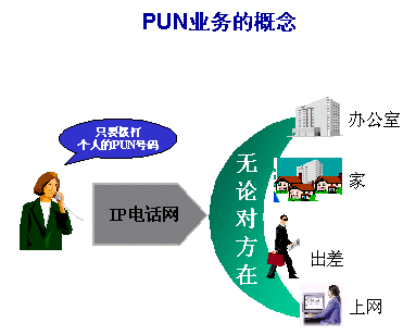 PUN業(yè)務(wù)首先給注冊用戶分配一個號碼,此號碼根據(jù)運營商所申請到的網(wǎng)號及用戶規(guī)模來規(guī)劃,如181XXXXXXX,申請到該號碼后,用戶可以通過各種方便的方式(如上網(wǎng)、打電話)等將此號碼綁定到任一特定終端,如家庭電話,移動手機等,綁定以后,任何人在任何地點都可以通過拔打此號碼,PUN系統(tǒng)將會根據(jù)用戶的設(shè)置,將此呼叫經(jīng)IP網(wǎng)絡(luò)送至對應(yīng)的終端,從而完成呼叫,PUN用戶還可以設(shè)置繁雜的規(guī)劃,如當(dāng)手機關(guān)機時,將呼叫送至某一固定電話,或在用戶上網(wǎng)時,首選PC機作為呼叫終端,也可以根據(jù)時間段來靈活設(shè)置終端,其設(shè)置方法也比傳統(tǒng)的呼叫轉(zhuǎn)移更加方便和靈活。其圖一: