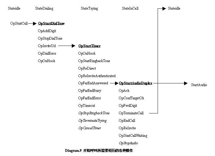 狀態(tài)中;這時用戶輸入被叫的電話號碼,或者是Url,在Dialing狀態(tài)中所有的事件被OpAddDigit操作處理,但是這個操作并不會讓當前的狀態(tài)從Dialing離開,而是維持到撥號完畢。