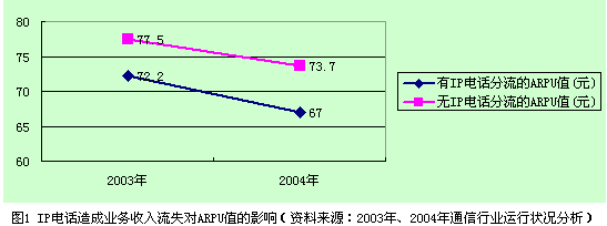 IP電話使ARPU值降低。2003年和2004年全國(guó)電信業(yè)務(wù)收入及電話用戶總數(shù)分別為4610億元、53199.8萬戶和5205億元、64726.7萬戶,平均ARPU值2003年為72.2元,2004年為67元。通過分析計(jì)算,由于IP電話造成的業(yè)務(wù)收入流失使2003年的平均ARPU值降低了5.3元,