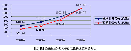 從圖2可知,固網(wǎng)運(yùn)營(yíng)商數(shù)據(jù)業(yè)務(wù)收入2003年和2004年僅占總收入的10.65%和12.5%,數(shù)據(jù)業(yè)務(wù)年增幅達(dá)34.2%,數(shù)據(jù)業(yè)務(wù)收入增加值為89.87億元;同期,因IP電話分流造成的長(zhǎng)途業(yè)務(wù)減收為146.06億元,可見在2004年數(shù)據(jù)業(yè)務(wù)的增長(zhǎng)彌補(bǔ)不了IP電話分流造成的長(zhǎng)途業(yè)務(wù)收入的流失。