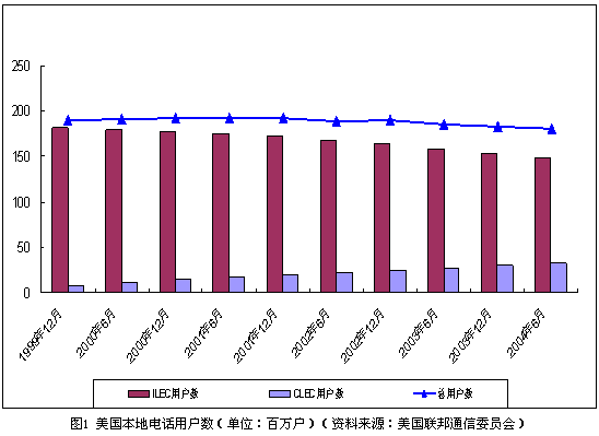 就整體而言,美國本地電話用戶總量穩(wěn)中有降,移動通信的替代作用開始顯現(xiàn)。截止到2004年6月,包括住宅和商業(yè)用戶,美國本地電話用戶總量達到1.81億戶。但與3年前相比,美國本地電話用戶數(shù)量實際減少了近1200萬戶。與此同時,移動用戶數(shù)量迅速增長。截止到2004年6月,美國移動電話用戶數(shù)比上年同期增長13%,達到1.673億戶,基本接近固定電話用戶的數(shù)量。