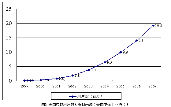 與此同時,Qwest也開始在明尼蘇達州提供類似的VoIP業(yè)務,并計劃在近期內推向全國。Verizon與北電網(wǎng)絡簽訂了大筆的訂單,計劃全面改造其本地電話網(wǎng)絡提供的VoIP業(yè)務。一些曾經著名的網(wǎng)絡電話公司(如Net2Phone)也開始進入傳統(tǒng)電話市場。截止到2004年2月底,Vonage的全IP網(wǎng)絡已經擁有13萬VoIP用戶。據(jù)美國電信工業(yè)協(xié)會預測,到2007年年末,全美的VoIP用戶將會達到1920萬戶,如圖3所示。