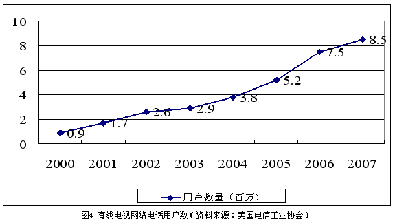 隨著有線電視用戶數(shù)量逐漸達到飽和,有線電視公司也在積極尋找新的利潤增長點。在過去的7年中,有線電視公司投入了高達800億美元的資金用于網(wǎng)絡升級改造,現(xiàn)在,大部分有線電視網(wǎng)絡已經可以提供包括寬帶接入、本地和長途電話、數(shù)字電視、視頻點播等在內的一攬子服務。到2004年末,有線電視公司已經擁有超過380萬的本地電話用戶。根據(jù)美國電信工業(yè)協(xié)會的估算,到2007年,全美將會有超過800萬的用戶選擇基于有線電視網(wǎng)的基本電信業(yè)務,如圖4所示。