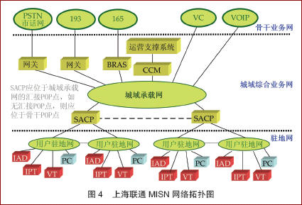 上海聯(lián)通MISN由5個(gè)部分組成(見圖4):(1)業(yè)務(wù)接入控制設(shè)備(SACP)。從用戶駐地網(wǎng)到城域網(wǎng)和骨務(wù)都必須通過SACP接的接入認(rèn)證、業(yè)務(wù)接入控制、網(wǎng)絡(luò)資源管理和服務(wù)質(zhì)量控制等。(2)呼叫管理控制模塊(CCM)。該模塊負(fù)責(zé)對(duì)用戶注冊(cè)的管理;通過SACP對(duì)業(yè)務(wù)接入進(jìn)行認(rèn)證和控制;與骨干業(yè)務(wù)網(wǎng)GK互通,完成各種業(yè)務(wù)的呼叫控制;與SACP一起采集計(jì)費(fèi)信息;負(fù)責(zé)控制語音和視頻媒體流的接入。(3)業(yè)務(wù)網(wǎng)關(guān)。聯(lián)通MISN是基于IP的分組網(wǎng),與基于電路交換的193長途電話骨干網(wǎng)和本地PSTN市話網(wǎng)互通時(shí),由于媒體層面和控制信令層面都不同,因此,需要通過網(wǎng)關(guān)進(jìn)行互通。(4)BRAS設(shè)備。負(fù)責(zé)將互聯(lián)網(wǎng)接入到165網(wǎng)。(5)業(yè)務(wù)運(yùn)營支撐系統(tǒng)。該系統(tǒng)包括維護(hù)網(wǎng)管系統(tǒng)、用戶終端管理系統(tǒng)、用戶管理(業(yè)務(wù)受理、用戶信息管理、用戶業(yè)務(wù)授權(quán)與認(rèn)證)以及本地MISN的計(jì)費(fèi)/營賬系統(tǒng),其對(duì)上的接口是各骨干業(yè)務(wù)網(wǎng)的運(yùn)維支撐系統(tǒng)。