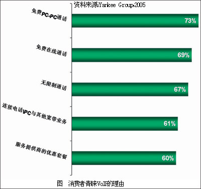 市場(chǎng)調(diào)研咨詢公司Yankee Group日前針對(duì)消費(fèi)者進(jìn)行了一次調(diào)查,結(jié)果顯示:73%的用戶喜歡VoIP是因?yàn)橥ㄟ^它可以進(jìn)行免費(fèi)的PC對(duì)PC通話;69%的用戶喜歡VoIP在線呼叫的功能;67%的用戶表示,VoIP廉價(jià)的通話費(fèi)用使人們可以無(wú)限制地通話,令人心動(dòng);61%的用戶表示,喜歡通過VoIP使電話與PC、其他在寬帶網(wǎng)絡(luò)上的一些活動(dòng)捆綁起來(lái);60%的用戶表示被服務(wù)提供商提供的優(yōu)惠套餐吸引。對(duì)于用戶來(lái)說(shuō),VoIP最大的吸引力似乎在于其低廉的話費(fèi)和為人們帶來(lái)的方便。