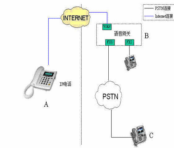 反之如果B點(diǎn)的當(dāng)?shù)仉娫捰脩鬋,透過(guò)電話撥接到B點(diǎn)的FXO口,然后利用INTERNET網(wǎng)絡(luò)轉(zhuǎn)接回A點(diǎn),這就是上車(chē)。