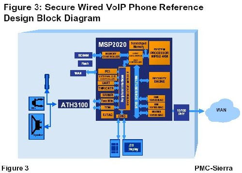 PMC-Sierra的MSP2020是VoIP電話參考平臺的基礎,可以使具備安全特性的VoIP產品在價格和性能上都達到新的高度。MSP2020不需要單獨的處理器、語音處理DSP、安全芯片以及多個以太網MAC,其全集成式設計簡化了電話設計復雜性,使整個產品成本(BOM)減少,可以讓OEM與服務提供商迅速向市場提供差異化VoIP電話產品。
