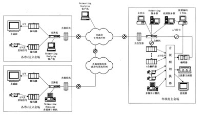 高清晰度視像會議系統(tǒng)的工作原理如圖所示。其中,主會場的音視頻信號經(jīng)過編碼器壓縮后,由主控臺控制,并通過廣播或組播方式經(jīng)由政府專用網(wǎng)絡(luò)分發(fā)到各分會場;各分會場的音視頻信號經(jīng)過編碼器壓縮為MPEG2的數(shù)據(jù)流后,通過以太網(wǎng)口發(fā)送至政府專用網(wǎng)絡(luò)上,再上傳到主會場的解碼器上并轉(zhuǎn)換為視頻信號,經(jīng)視頻陣列器處理后顯示在屏幕上;主控臺可以根據(jù)需要控制各分會場的編解碼器、電動調(diào)焦攝像機及控制器。