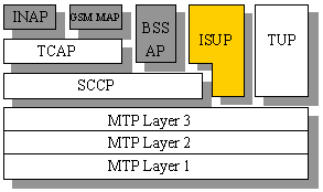 ISUP的功能主要是提供在交換機(jī)之間的電路連接控制(非三方通話控制)。它和ISDN用戶接入到交換機(jī)的ISDN協(xié)議(Q.931)是密切相關(guān)的。下圖是ISUP在SS7協(xié)議棧中的位置圖: