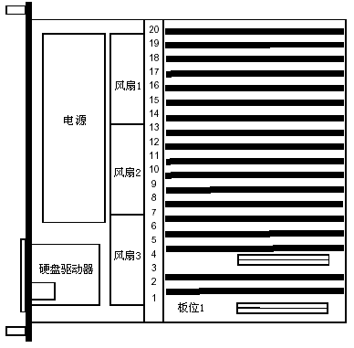DSC110由若干水平插在卡槽兩側(cè)的板卡構(gòu)成,卡槽固定在機(jī)箱的底部的后側(cè)。冷卻扇、硬盤、電源、軟盤驅(qū)動(dòng)器和前端面板顯示卡都固定在機(jī)箱上。