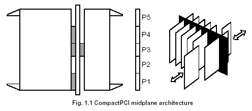 CompactPCI是中間背板結(jié)構(gòu),即有多個卡插在機(jī)箱前部和后部的結(jié)構(gòu)。該體系結(jié)構(gòu)的背板位于前向插卡和后向插卡之間,提供機(jī)箱中所有插槽間的總線連接和同一機(jī)箱中前向和后向插卡之間的連接。所有的插卡通過指定的從P1到P5插槽連接到背板。這些插槽的功能在CompactPCI